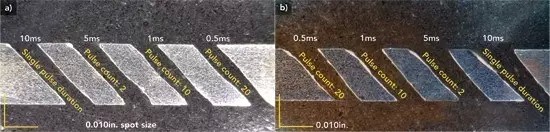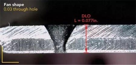 圖2:脈沖鉆孔,左側(cè)孔徑為0.010in,右側(cè)孔徑為0.030in