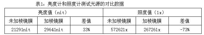 該膜材通過內部微棱鏡結構改變光的發散角度,將光收集到正前方從而達到提高該光源正方向的能量利用率。實驗使用的照度計為柯尼卡美能達CL-200,亮度計為CS-160。相機為東芝CSFS20BC2,鏡頭為computar 2514。分別使用照度計,亮度計測試該背光源不加棱鏡膜和加入棱鏡膜后的照度,亮度并與相機拍攝出來圖片灰度值進行對比。